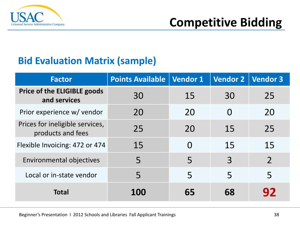 Bid Evaluation Matrix (sample) • Competitive Bidding