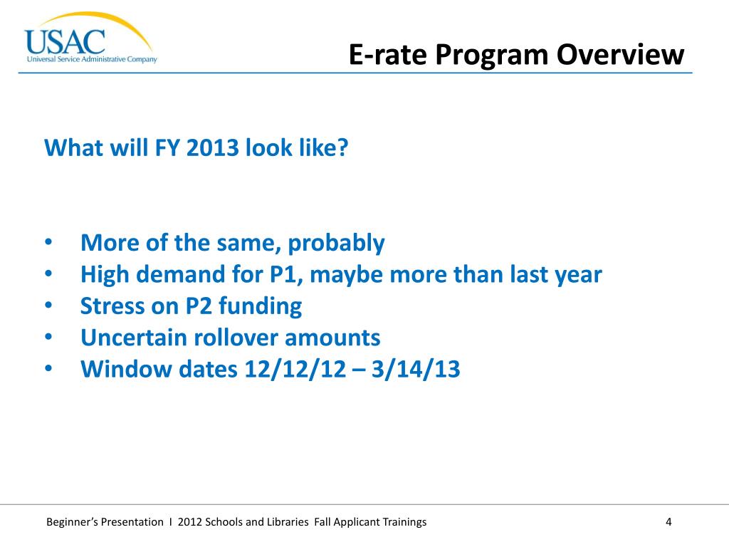 FCC FY 2012 Rollover Order impact • What will E-rate FY 2013 look like? • Training agenda highlights • Overview • The E-rate Program