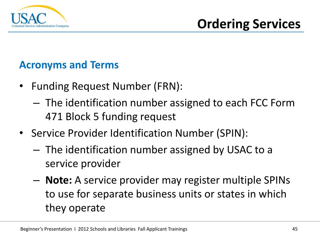 Funding Request Number (FRN): • The identification number assigned to each FCC Form 471 Block 5 funding request • Service Provider Identification Number (SPIN): • The identification number assigned by USAC to a service provider • Note: A service provider may register multiple SPINs to use for separate business units or states in which they operate • Acronyms and Terms • Ordering Services