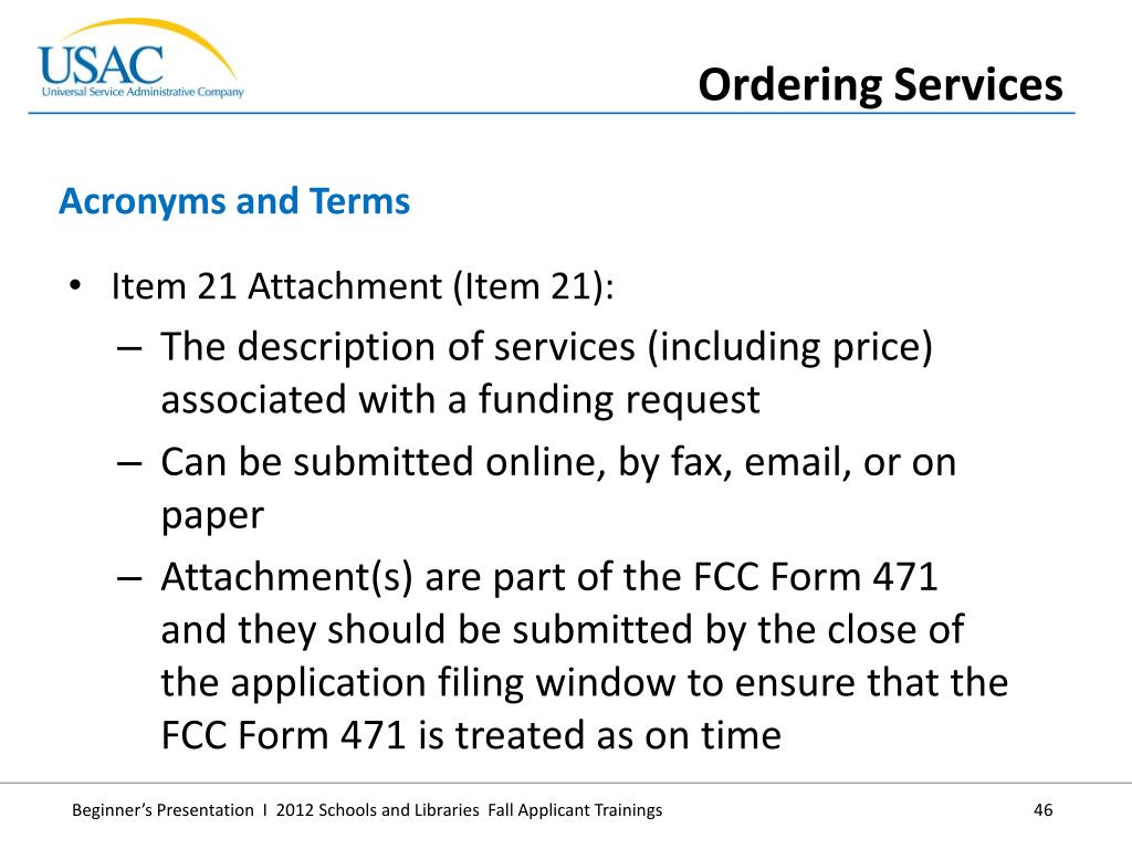 Item 21 Attachment (Item 21): • The description of services (including price) associated with a funding request • Can be submitted online, by fax, email, or on paper • Attachment(s) are part of the FCC Form 471 and they should be submitted by the close of the application filing window to ensure that the FCC Form 471 is treated as on time • Acronyms and Terms • Ordering Services