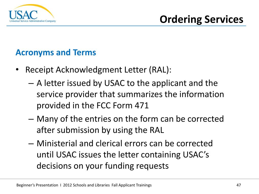 Receipt Acknowledgment Letter (RAL): • A letter issued by USAC to the applicant and the service provider that summarizes the information provided in the FCC Form 471 • Many of the entries on the form can be corrected after submission by using the RAL • Ministerial and clerical errors can becorrected until USAC issues the letter containing USAC’s decisions on your funding requests • Acronyms and Terms • Ordering Services