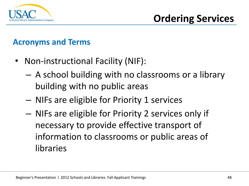 Non-instructional Facility (NIF): • A school building with no classrooms or a library building with no public areas • NIFs are eligible for Priority 1 services • NIFs are eligible for Priority 2 services only if necessary to provide effective transport of information to classrooms or public areas of libraries • Acronyms and Terms • Ordering Services