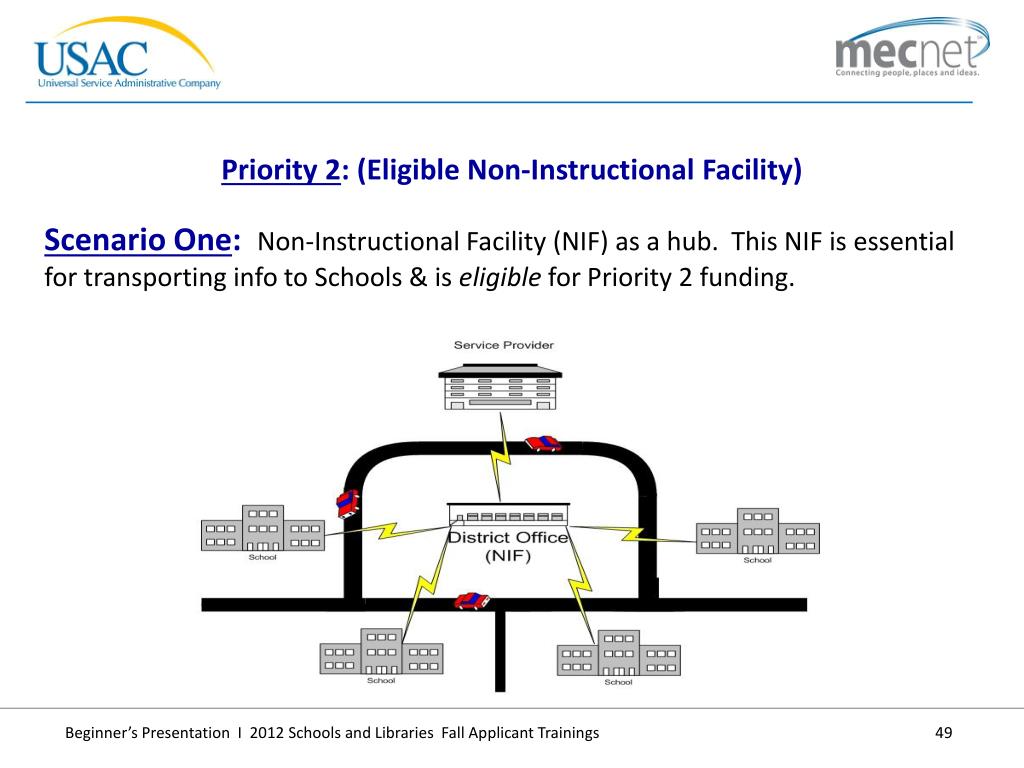 Priority 2: (Eligible Non-Instructional Facility) Scenario One: Non-Instructional Facility (NIF) as a hub. This NIF is essential for transporting info to Schools & is eligible for Priority 2 funding.