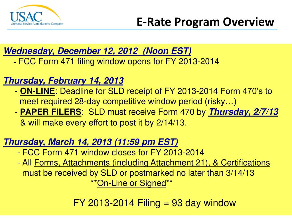 Wednesday, December 12, 2012 (Noon EST) • - FCC Form 471 filing window opens for FY 2013-2014 • Thursday, February 14, 2013 • - ON-LINE: Deadline for SLD receipt of FY 2013-2014 Form 470’s to • meet required 28-day competitive window period (risky…) • - PAPER FILERS: SLD must receive Form 470 by Thursday, 2/7/13 • & will make every effort to post it by 2/14/13. • Thursday, March 14, 2013 (11:59 pm EST) • - FCC Form 471 window closes for FY 2013-2014 • All Forms, Attachments (including Attachment 21), & Certifications • must be received by SLD or postmarked no later than 3/14/13 • **On-Line or Signed** • FY 2013-2014 Filing = 93 day window • E-Rate Program Overview