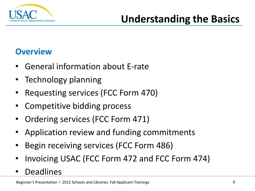 General information about E-rate • Technology planning • Requesting services (FCC Form 470) • Competitive bidding process • Ordering services (FCC Form 471) • Application review and funding commitments • Begin receiving services (FCC Form 486) • Invoicing USAC (FCC Form 472 and FCC Form 474) • Deadlines • Overview • Understanding the Basics