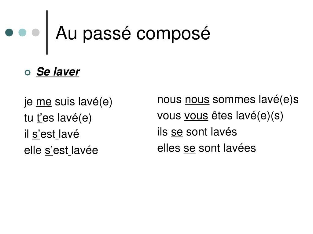 Se laver je me suis lavé(e) tu t’es lavé(e) il s’estlavé elle s’estlavée nous nous sommes lavé(e)s vous vous êtes lavé(e)(s) ils se sont lavés elles se sont lavées Au passé composé