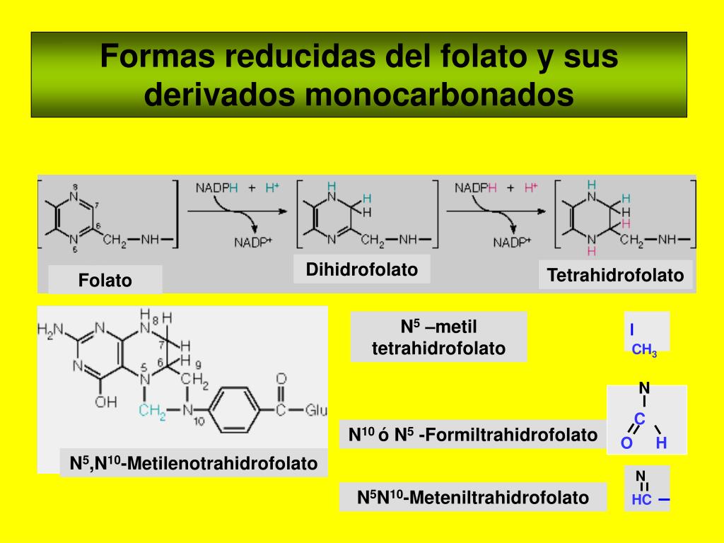 N C OH CH3 N HC Formas reducidas del folato y sus derivados monocarbonados Dihidrofolato Tetrahidrofolato Folato N5 –metil tetrahidrofolato N10 ó N5 -Formiltrahidrofolato N5,N10-Metilenotrahidrofolato N5N10-Meteniltrahidrofolato