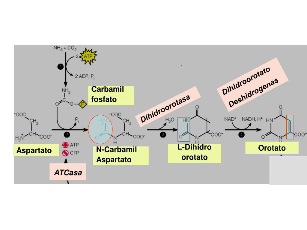 . Dihidroorotato Deshidrogenas Carbamil fosfato Dihidroorotasa Orotato Aspartato L-Dihidro orotato N-Carbamil Aspartato ATCasa