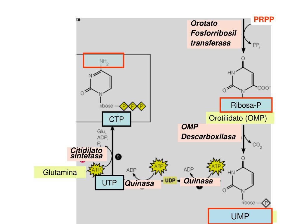PRPP Orotato Fosforribosil transferasa Ribosa-P Orotilidato (OMP) CTP OMP Descarboxilasa Citidilatosintetasa Glutamina UTP Quinasa Quinasa UMP Uridilato (UMP)