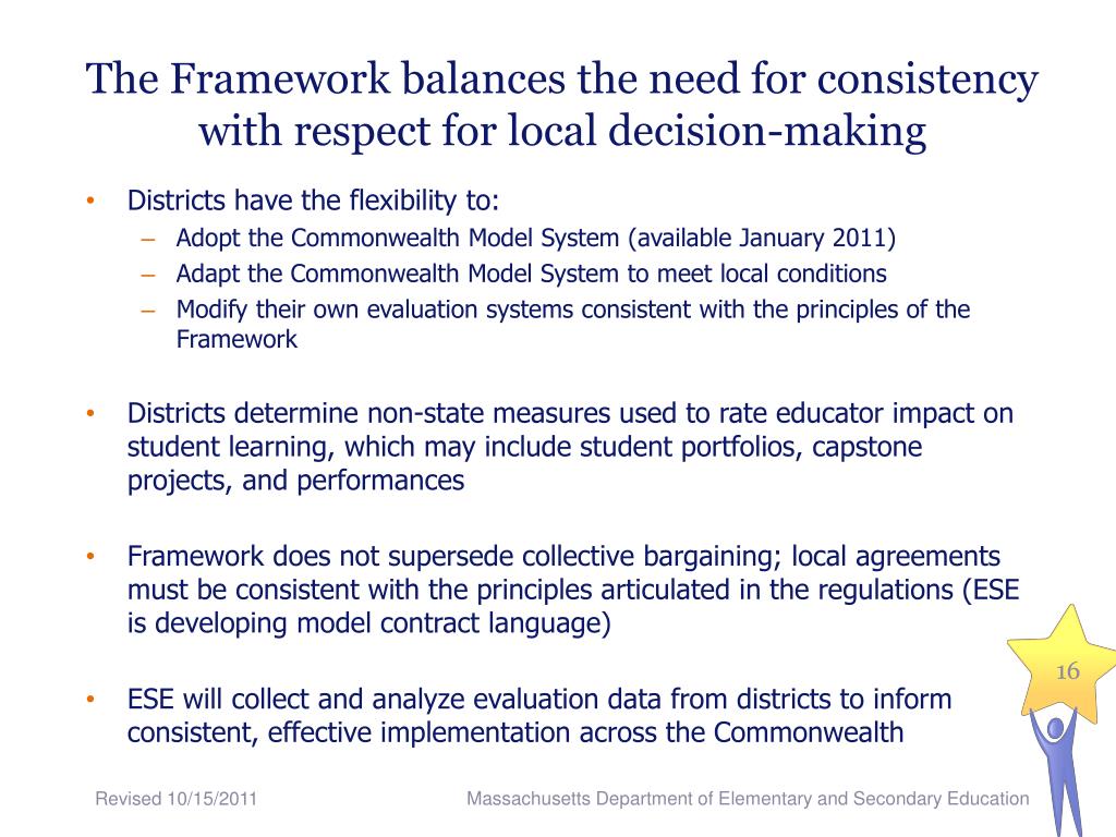 The Framework balances the need for consistency with respect for local decision-making • Districts have the flexibility to: • Adopt the Commonwealth Model System (available January 2011) • Adapt the Commonwealth Model System to meet local conditions • Modify their own evaluation systems consistent with the principles of the Framework • Districts determine non-state measures used to rate educator impact on student learning, which may include student portfolios, capstone projects, and performances • Framework does not supersede collective bargaining; local agreements must be consistent with the principles articulated in the regulations (ESE is developing model contract language) • ESE will collect and analyze evaluation data from districts to inform consistent, effective implementation across the Commonwealth Massachusetts Department of Elementary and Secondary Education