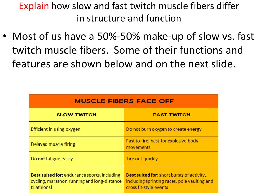 Explain how slow and fast twitch muscle fibers differ in structure and function • Most of us have a 50%-50% make-up of slow vs. fast twitch muscle fibers. Some of their functions and features are shown below and on the next slide.