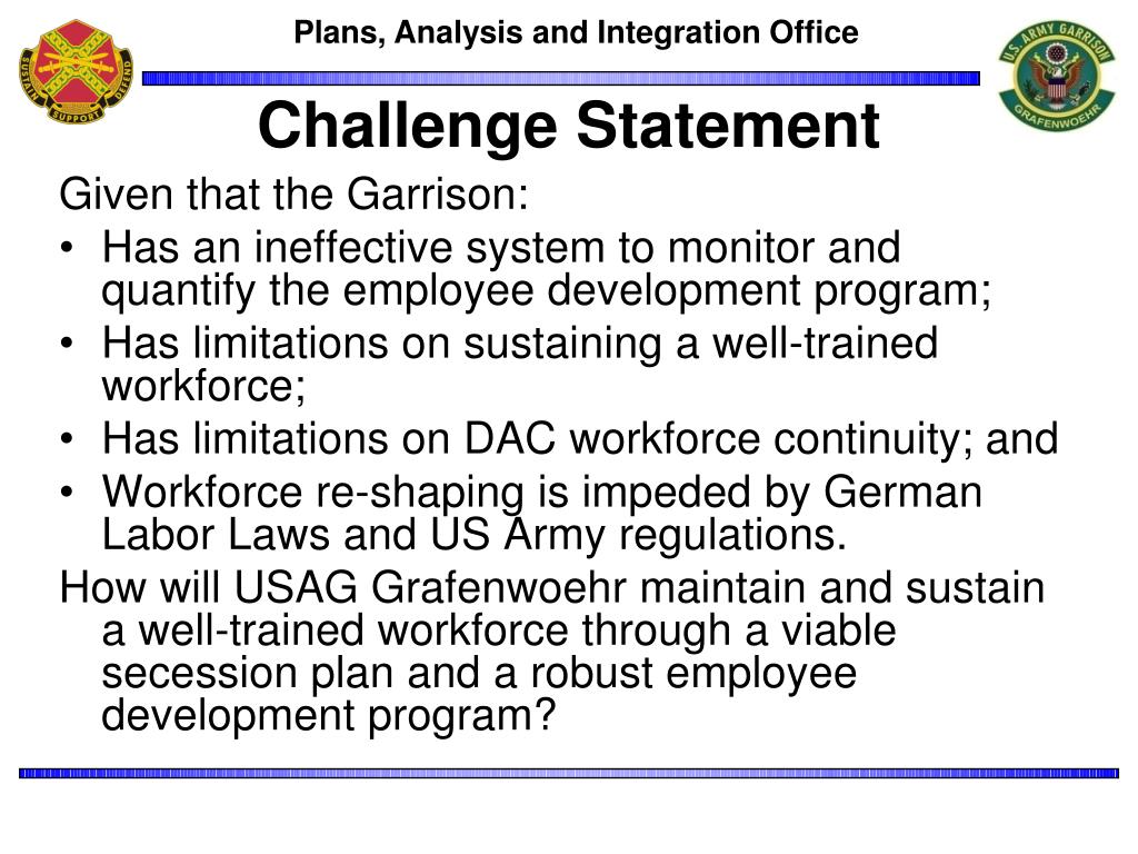 Challenge Statement Given that the Garrison: • Has an ineffective system to monitor and quantify the employee development program; • Has limitations on sustaining a well-trained workforce; • Has limitations on DAC workforce continuity; and • Workforce re-shaping is impeded by German Labor Laws and US Army regulations. How will USAG Grafenwoehr maintain and sustain a well-trained workforce through a viable secession plan and a robust employee development program?