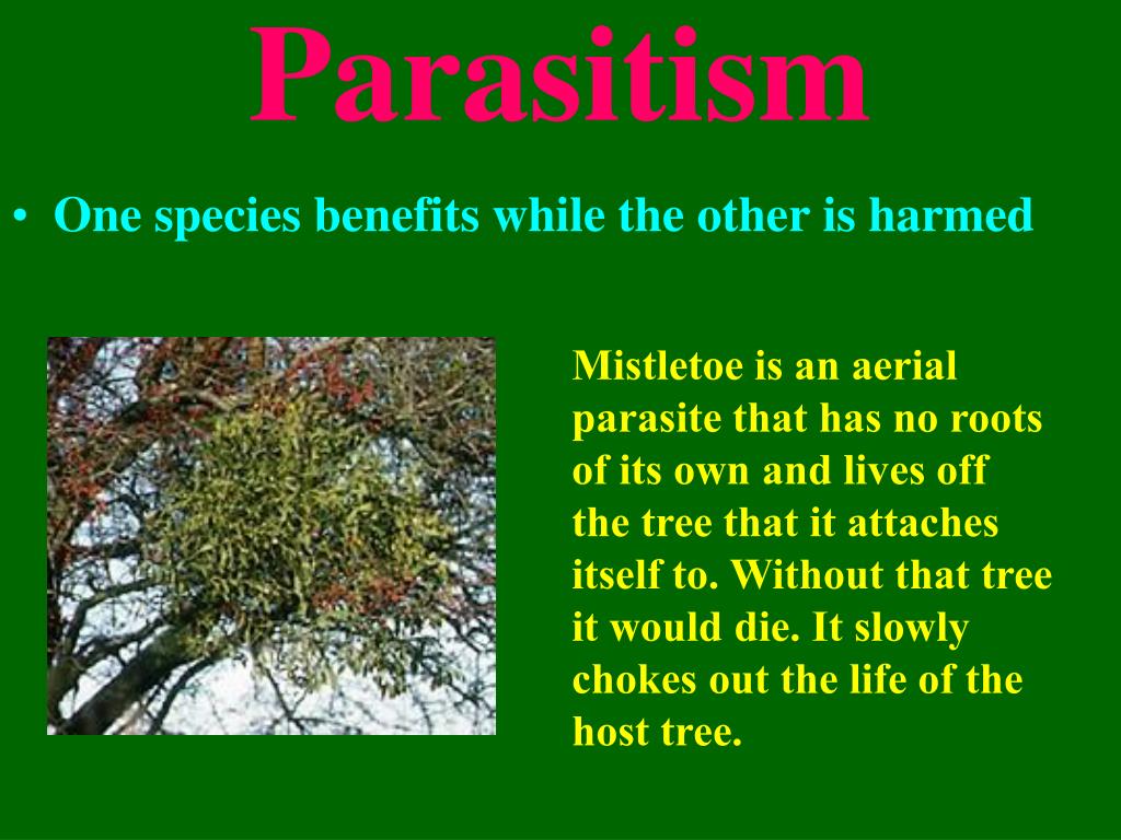 Parasitism • One species benefits while the other is harmed Mistletoe is an aerial parasite that has no roots of its own and lives off the tree that it attaches itself to. Without that tree it would die. It slowly chokes out the life of the host tree.
