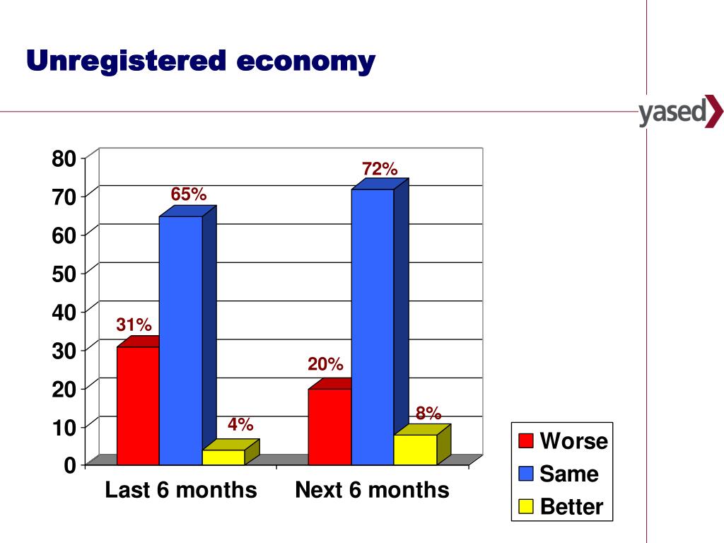 In the last 6 months Worse SameBetter Economic stability36 % 52 % 12 % Legal framework and enforcement of laws 19 %74 % 7 % Intellectual property rights7 %85 % 7% Financial environment51 %41 % 7% Fairness in competition 21 % 71 % 9% Taxes and Incentives13%74 % 13 % Unregistered economy 31%65 % 4% Bureaucratic red tape 19%72 % 9 %