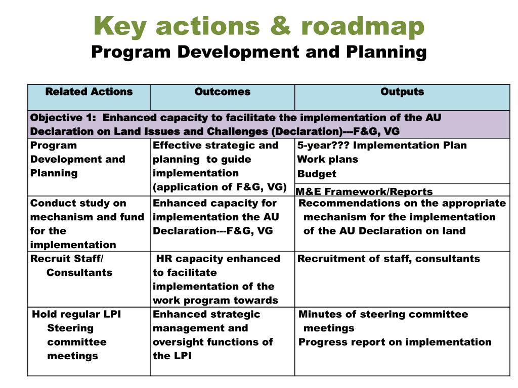 AU-ECA-AfDB Land Policy Initiative • Dialogue on land policy related agenda to address challenges • Continental/Regional Consultations; • Enhanced knowledge of the challenges; gaps in processes/institutions • Regional assessment reports • F&G; • Partnerships and Commitment • Govts; RECs; CSO (Experts; Ministers; Heads of States) • Devt. partenrs • Clear understanding by partners of African ownership of the initiative • Building synergy and providing technical and financial support to the initiative… • Resource Mobilisation/partnerships • (IFAD, FAO, Rockefeller Foundation, UNDP, UNHABITAT, World Bank, others)
