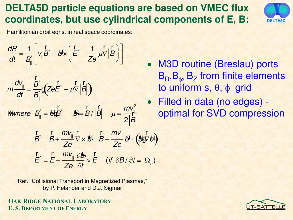 DELTA5D DELTA5D particle equations are based on VMEC flux coordinates, but use cylindrical components of E, B: Hamilitonian orbit eqns. in real space coordinates: • M3D routine (Breslau) ports BR,BBZ from finite elements to uniform s, , grid • Filled in data (no edges) - optimal for SVD compression Ref. “Collisional Transport in Magnetized Plasmas,” by P. Helander and D.J. Sigmar