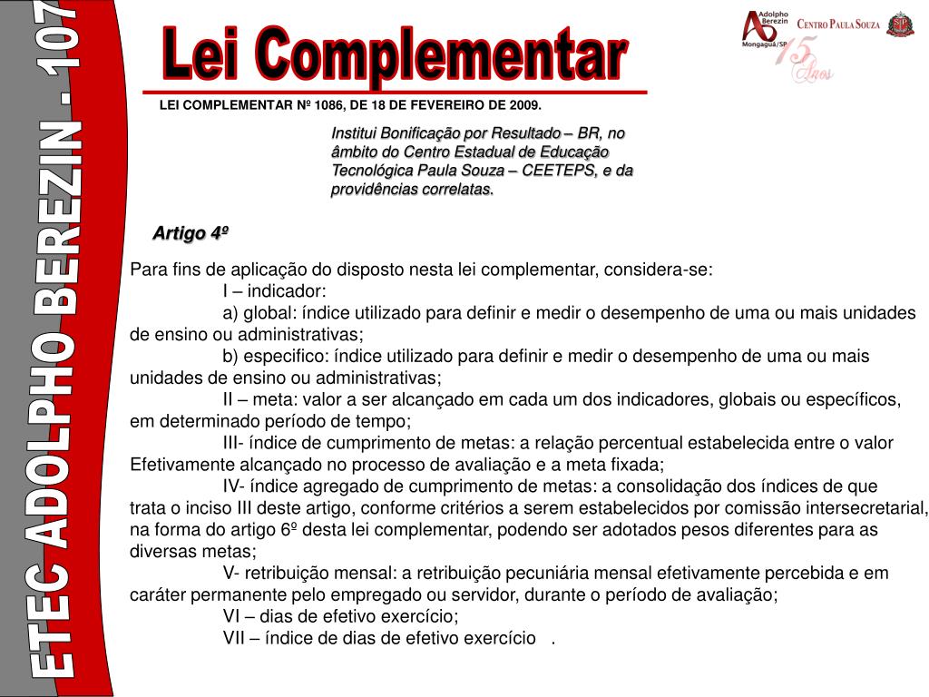 Lei Complementar LEI COMPLEMENTAR Nº 1086, DE 18 DE FEVEREIRO DE 2009. Institui Bonificação por Resultado – BR, no âmbito do Centro Estadual de Educação Tecnológica Paula Souza – CEETEPS, e da providências correlatas. Artigo 4º Para fins de aplicação do disposto nesta lei complementar, considera-se: I – indicador: a) global: índice utilizado para definir e medir o desempenho de uma ou mais unidades de ensino ou administrativas; b) especifico: índice utilizado para definir e medir o desempenho de uma ou mais unidades de ensino ou administrativas; II – meta: valor a ser alcançado em cada um dos indicadores, globais ou específicos, em determinado período de tempo; III- índice de cumprimento de metas: a relação percentual estabelecida entre o valor Efetivamente alcançado no processo de avaliação e a meta fixada; IV- índice agregado de cumprimento de metas: a consolidação dos índices de que trata o inciso III deste artigo, conforme critérios a serem estabelecidos por comissão intersecretarial, na forma do artigo 6º desta lei complementar, podendo ser adotados pesos diferentes para as diversas metas; V- retribuição mensal: a retribuição pecuniária mensal efetivamente percebida e em caráter permanente pelo empregado ou servidor, durante o período de avaliação; VI – dias de efetivo exercício; VII – índice de dias de efetivo exercício . ETEC ADOLPHO BEREZIN - 107