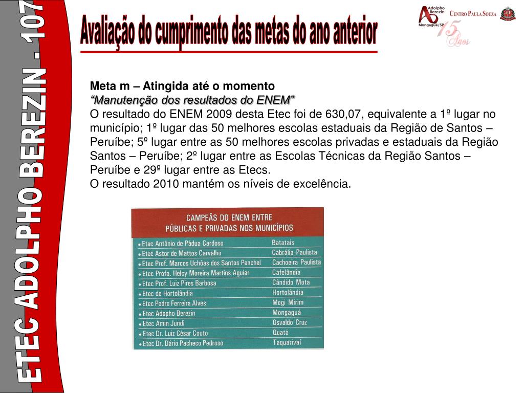 Avaliação do cumprimento das metas do ano anterior Meta m – Atingida até o momento “Manutenção dos resultados do ENEM” O resultado do ENEM 2009 desta Etec foi de 630,07, equivalente a 1º lugar no município; 1º lugar das 50 melhores escolas estaduais da Região de Santos – Peruíbe; 5º lugar entre as 50 melhores escolas privadas e estaduais da Região Santos – Peruíbe; 2º lugar entre as Escolas Técnicas da Região Santos – Peruíbe e 29º lugar entre as Etecs. O resultado 2010 mantém os níveis de excelência. ETEC ADOLPHO BEREZIN - 107