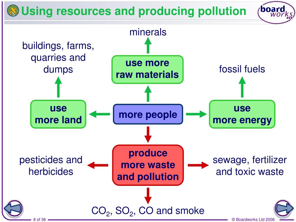 more people Using resources and producing pollution minerals buildings, farms, quarries and dumps use moreraw materials fossil fuels use more land use more energy produce more waste and pollution pesticides and herbicides sewage, fertilizer and toxic waste CO2, SO2, CO and smoke