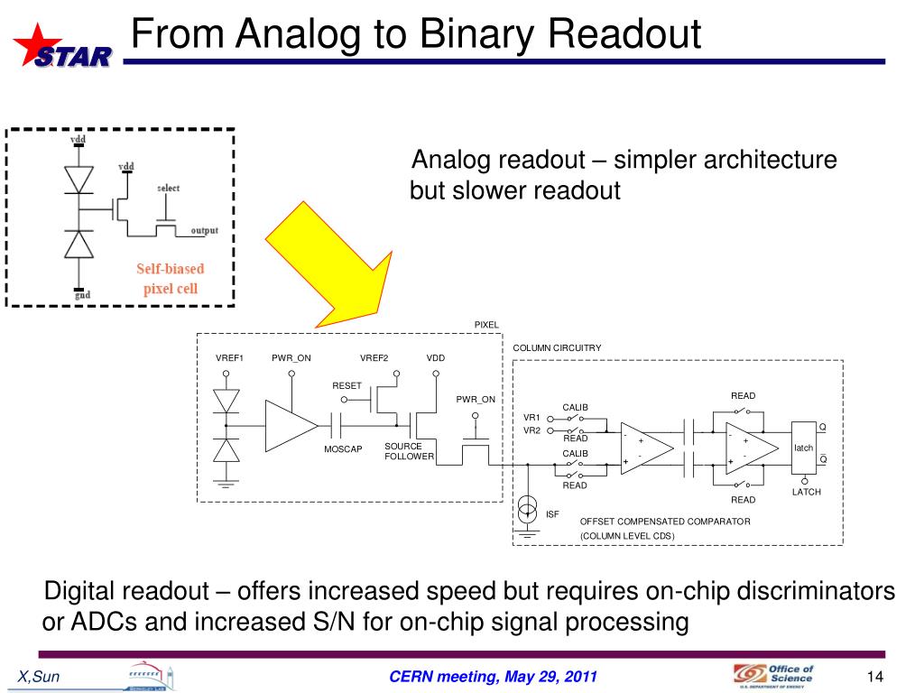 From Analog to Binary Readout Analog readout – simpler architecture but slower readout Digital readout – offers increased speed but requires on-chip discriminators or ADCs and increased S/N for on-chip signal processing