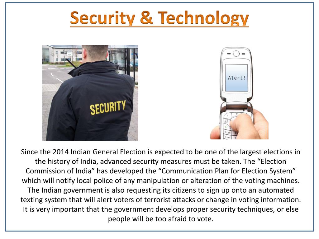Security & Technology Since the 2014 Indian General Election is expected to be one of the largest elections in the history of India, advanced security measures must be taken. The “Election Commission of India” has developed the “Communication Plan for Election System” which will notify local police of any manipulation or alteration of the voting machines. The Indian government is also requesting its citizens to sign up onto an automated texting system that will alert voters of terrorist attacks or change in voting information. It is very important that the government develops proper security techniques, or else people will be too afraid to vote.