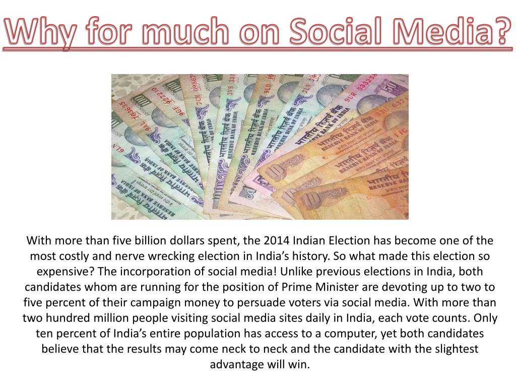Why for much on Social Media? With more than five billion dollars spent, the 2014 Indian Election has become one of the most costly and nerve wrecking election in India’s history. So what made this election so expensive? The incorporation of social media! Unlike previous elections in India, both candidates whom are running for the position of Prime Minister are devoting up to two to five percent of their campaign money to persuade voters via social media. With more than two hundred million people visiting social media sites daily in India, each vote counts. Only ten percent of India’s entire population has access to a computer, yet both candidates believe that the results may come neck to neck and the candidate with the slightest advantage will win.