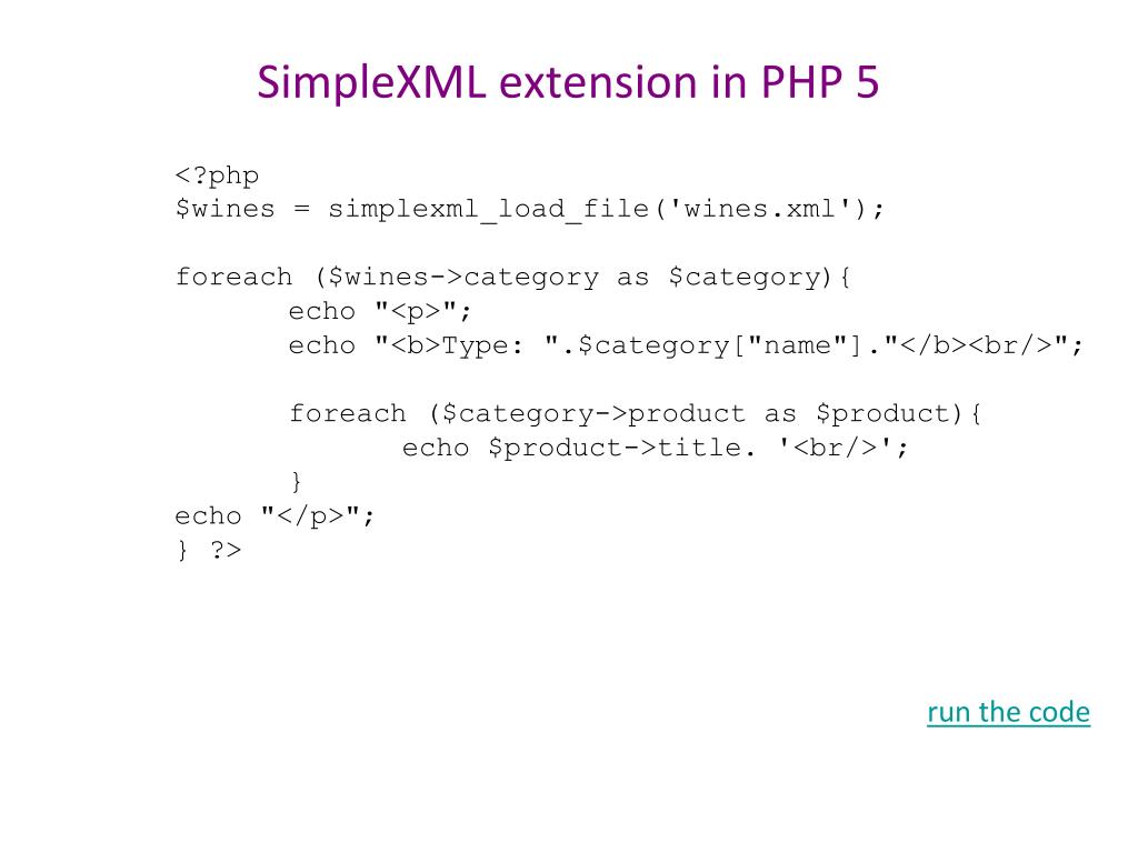 SimpleXML extension in PHP 5 <?php $wines = simplexml_load_file('wines.xml'); foreach ($wines->category as $category){ echo "<p>"; echo "<b>Type: ".$category["name"]."</b><br/>"; foreach ($category->product as $product){ echo $product->title. '<br/>'; } echo "</p>"; } ?> run the code