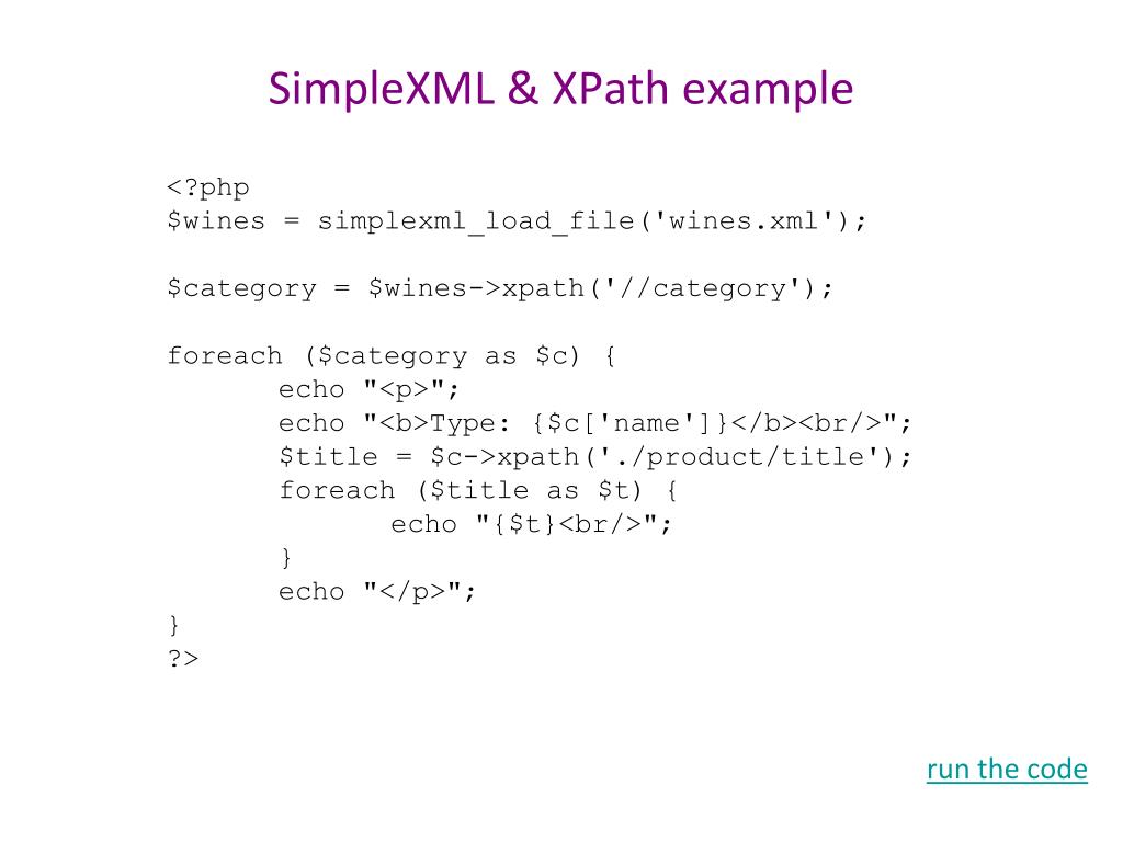 SimpleXML & XPath example <?php $wines = simplexml_load_file('wines.xml'); $category = $wines->xpath('//category'); foreach ($category as $c) { echo "<p>"; echo "<b>Type: {$c['name']}</b><br/>"; $title = $c->xpath('./product/title'); foreach ($title as $t) { echo "{$t}<br/>"; } echo "</p>"; } ?> run the code