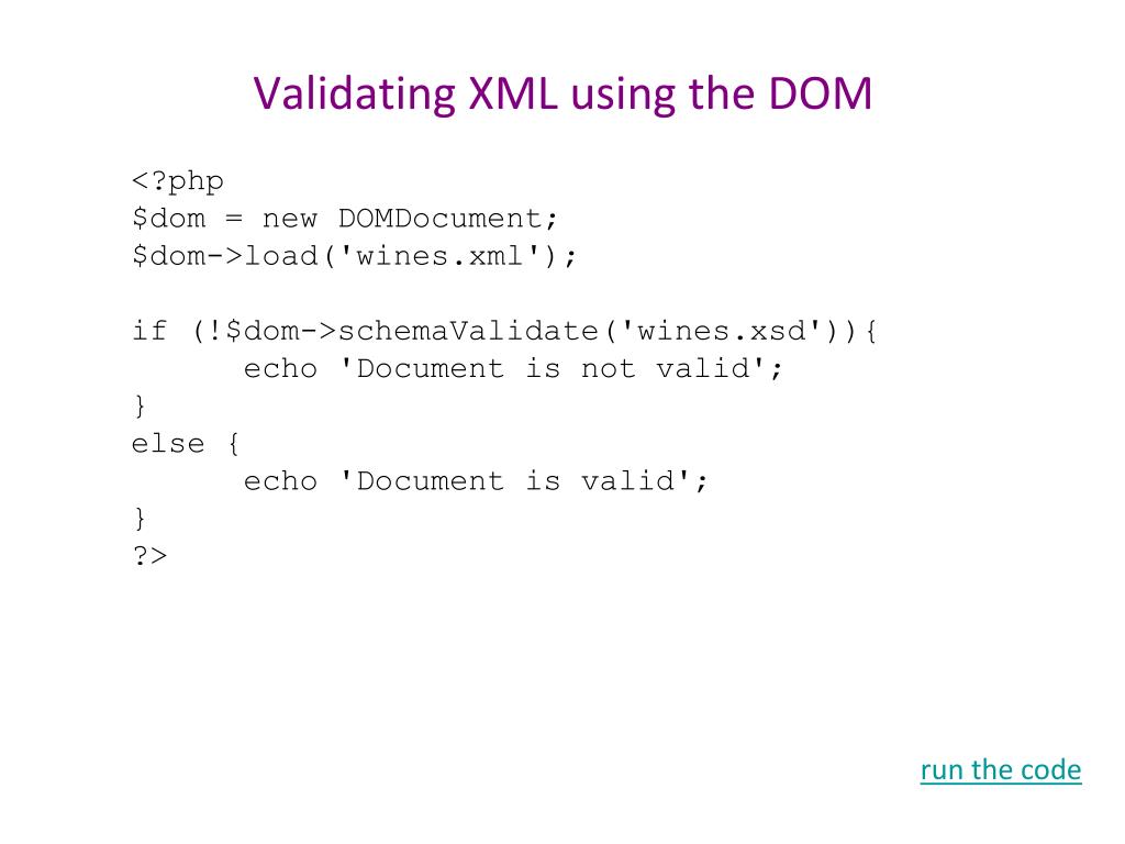 Validating XML using the DOM <?php $dom = new DOMDocument; $dom->load('wines.xml'); if (!$dom->schemaValidate('wines.xsd')){ echo 'Document is not valid'; } else { echo 'Document is valid'; } ?> run the code