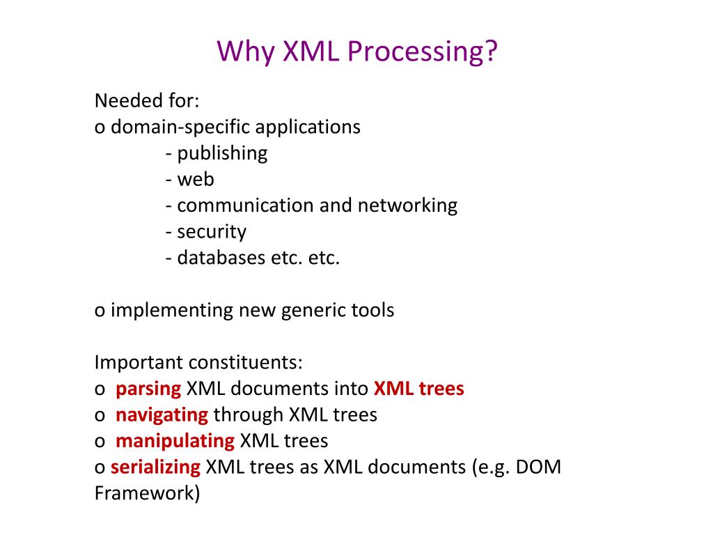 Why XML Processing? • Needed for: • domain-specific applications • - publishing • - web • - communication and networking • - security • - databases etc. etc. • implementing new generic tools • Important constituents: • parsing XML documents into XML trees • navigating through XML trees • manipulating XML trees • serializing XML trees as XML documents (e.g. DOM Framework)