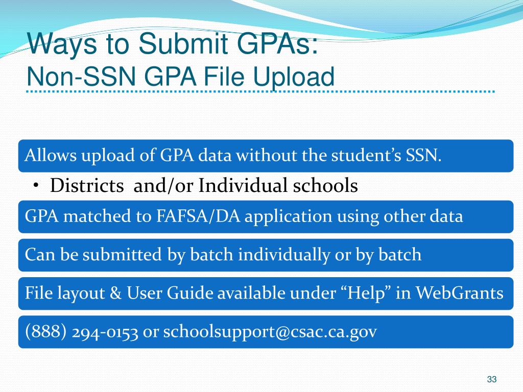 What Your Students Need to Know • Once the application is filed; • Create and maintain a WebGrants 4 Students account • If awarded, confirm HS Grad Date in June • Once the college of attendance is decided ensure that WebGrants 4 Students has the correct school on file • Contact the Financial Aid Office at the college of attendance to see what needs to be done in order to receive Cal Grant payment(s) • Keep track of Cal Grant payments using the Payment History screen on WebGrants 4 Students • If a School Change or Leave of Absence is necessary, submit to the Commission directly using WebGrants 4 Students