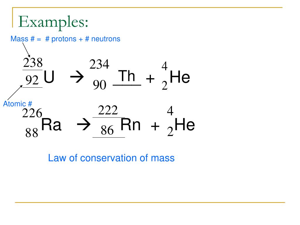 Examples: Mass # = # protons + # neutrons 238 U ___ + He Th 92 Atomic # 222 Ra Rn + He 86 Law of conservation of mass