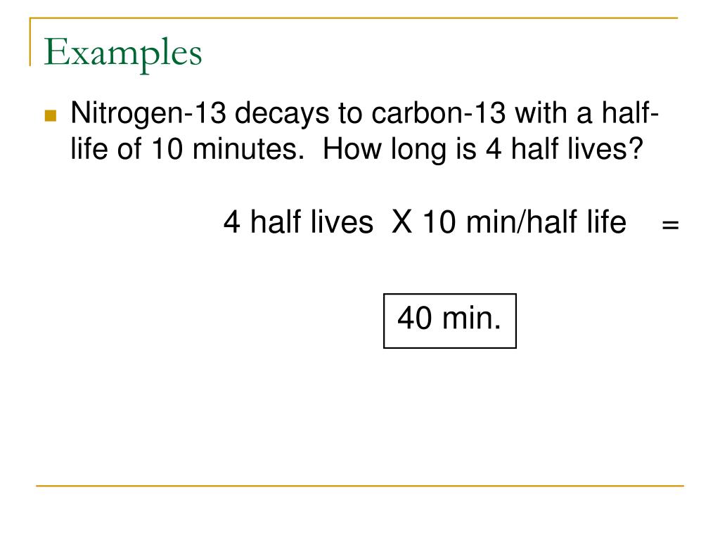Examples • Nitrogen-13 decays to carbon-13 with a half-life of 10 minutes. How long is 4 half lives? 4 half lives X 10 min/half life = 40 min.