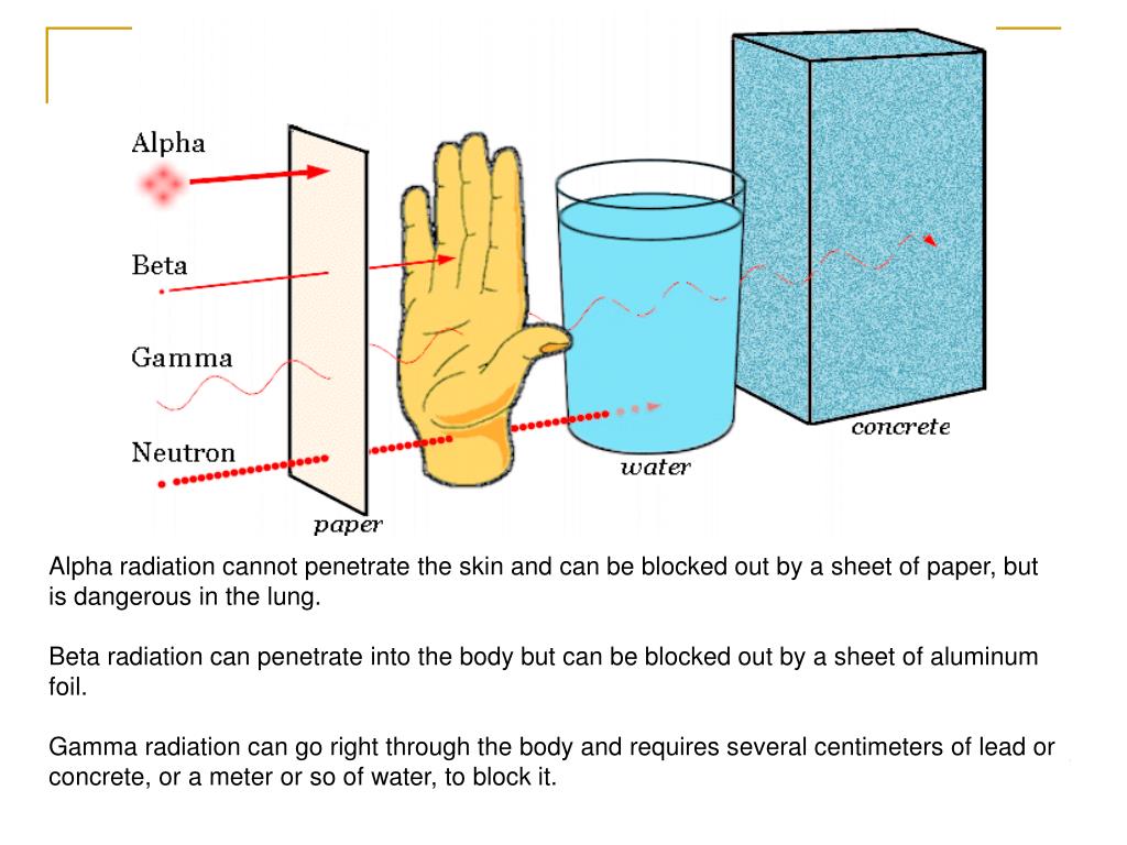 Alpha radiation cannot penetrate the skin and can be blocked out by a sheet of paper, but is dangerous in the lung. Beta radiation can penetrate into the body but can be blocked out by a sheet of aluminum foil. Gamma radiation can go right through the body and requires several centimeters of lead or concrete, or a meter or so of water, to block it.