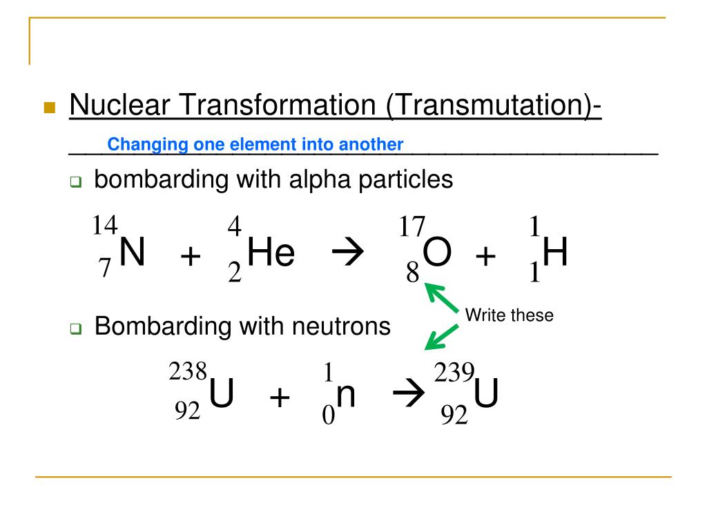 Nuclear Transformation (Transmutation)- ____________________________________ • bombarding with alpha particles • Bombarding with neutrons Changing one element into another N + He O + H Write these U + n U