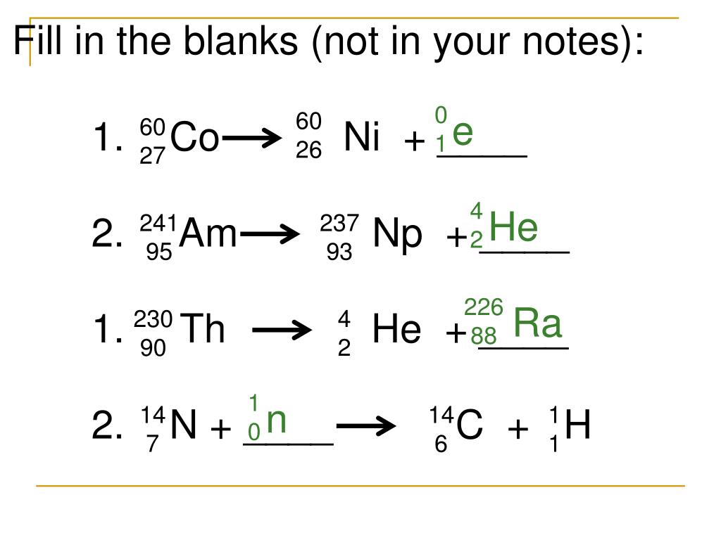 Fill in the blanks (not in your notes): 0 1 60 26 e • Co Ni + ____ • Am Np + ____ • Th He + ____ • N + ____ C + H 60 27 4 2 He 241 95 237 93 226 88 Ra 230 90 4 2 1 0 n 14 7 14 6 1 1
