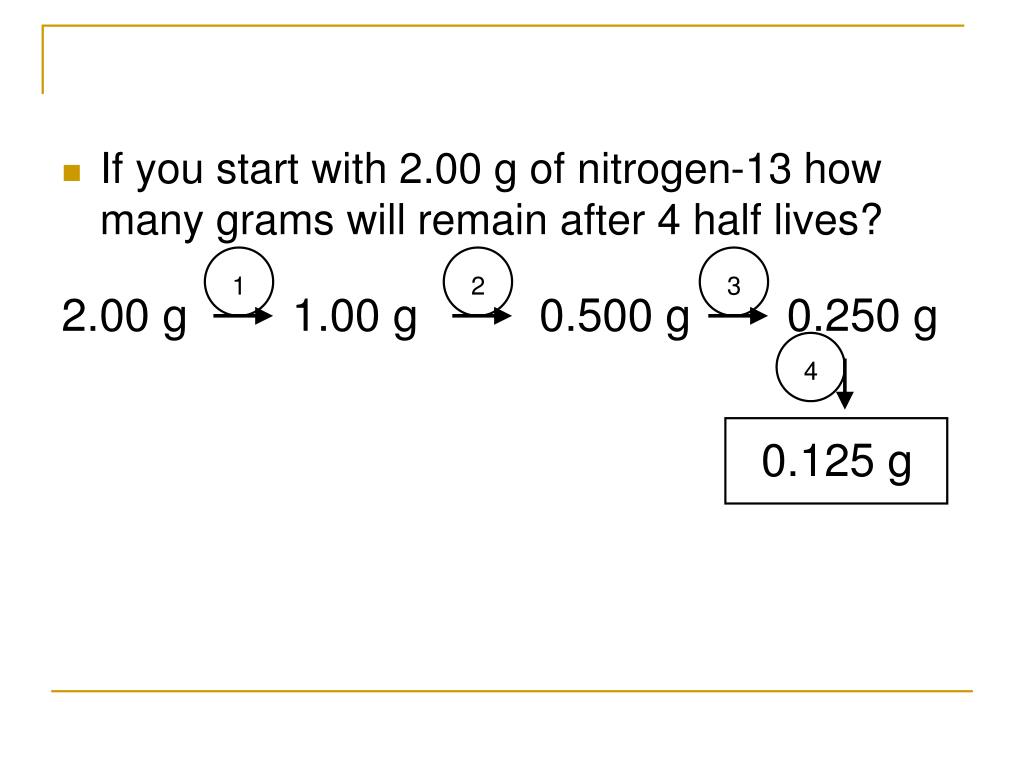 If you start with 2.00 g of nitrogen-13 how many grams will remain after 4 half lives? 1 2 3 2.00 g 1.00 g 0.500 g 0.250 g 4 0.125 g