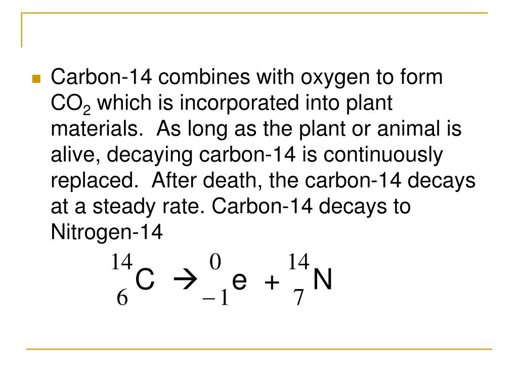 Carbon-14 combines with oxygen to form CO2 which is incorporated into plant materials. As long as the plant or animal is alive, decaying carbon-14 is continuously replaced. After death, the carbon-14 decays at a steady rate. Carbon-14 decays to Nitrogen-14 C e + N
