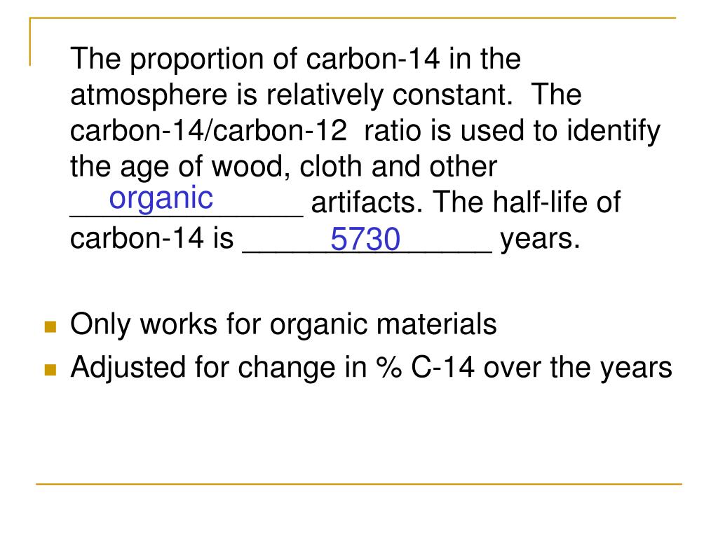 The proportion of carbon-14 in the atmosphere is relatively constant. The carbon-14/carbon-12 ratio is used to identify the age of wood, cloth and other ______________ artifacts. The half-life of carbon-14 is _______________ years. • Only works for organic materials • Adjusted for change in % C-14 over the years organic 5730