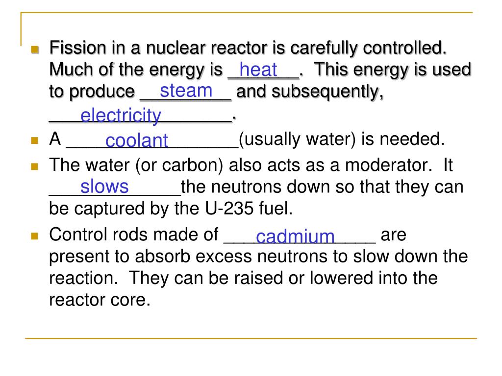 heat steam • Fission in a nuclear reactor is carefully controlled. Much of the energy is _______. This energy is used to produce _________ and subsequently, __________________. • A _________________(usually water) is needed. • The water (or carbon) also acts as a moderator. It _____________the neutrons down so that they can be captured by the U-235 fuel. • Control rods made of _______________ are present to absorb excess neutrons to slow down the reaction. They can be raised or lowered into the reactor core. electricity coolant slows cadmium