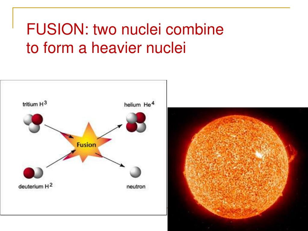 FUSION: two nuclei combine to form a heavier nuclei Fusion – two nuclei combine to form a heavier nucleus.