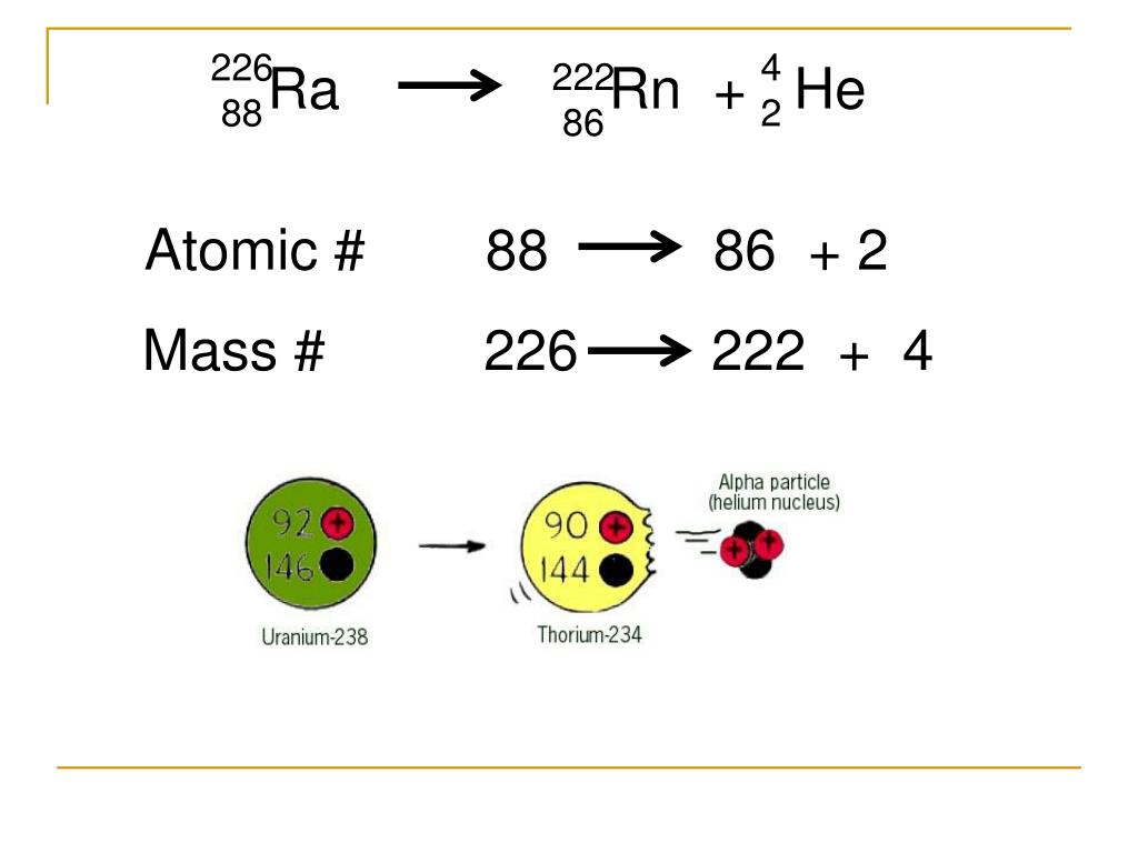 226 88 4 2 Ra Rn + He 222 86 Atomic # 88 86 + 2 Mass # 226 222 + 4