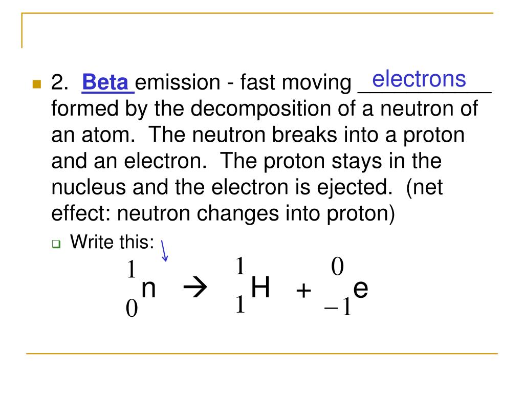 electrons • 2. Betaemission - fast moving ___________ formed by the decomposition of a neutron of an atom. The neutron breaks into a proton and an electron. The proton stays in the nucleus and the electron is ejected. (net effect: neutron changes into proton) • Write this: n H + e