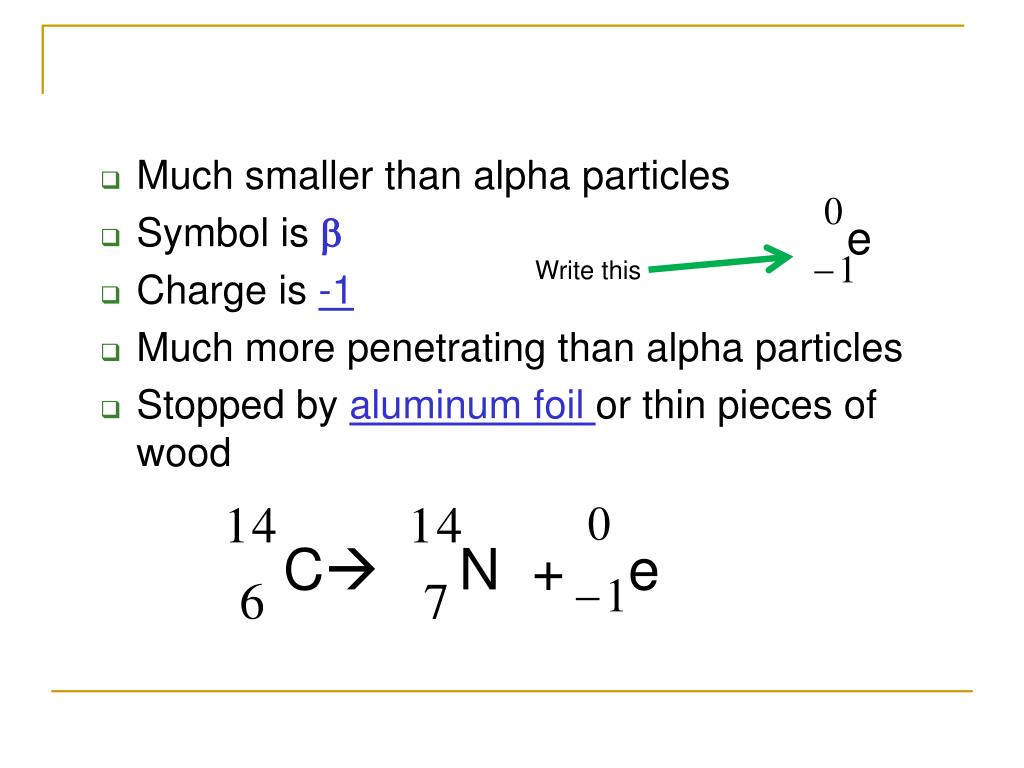 Much smaller than alpha particles • Symbol is • Charge is -1 • Much more penetrating than alpha particles • Stopped by aluminum foil or thin pieces of wood e Write this C N + e