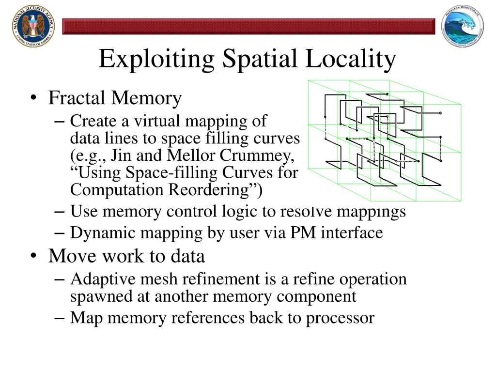 Exploiting Spatial Locality • Fractal Memory • Create a virtual mapping of data lines to space filling curves (e.g., Jin and Mellor Crummey, “Using Space-filling Curves for Computation Reordering”) • Use memory control logic to resolve mappings • Dynamic mapping by user via PM interface • Move work to data • Adaptive mesh refinement is a refine operation spawned at another memory component • Map memory references back to processor