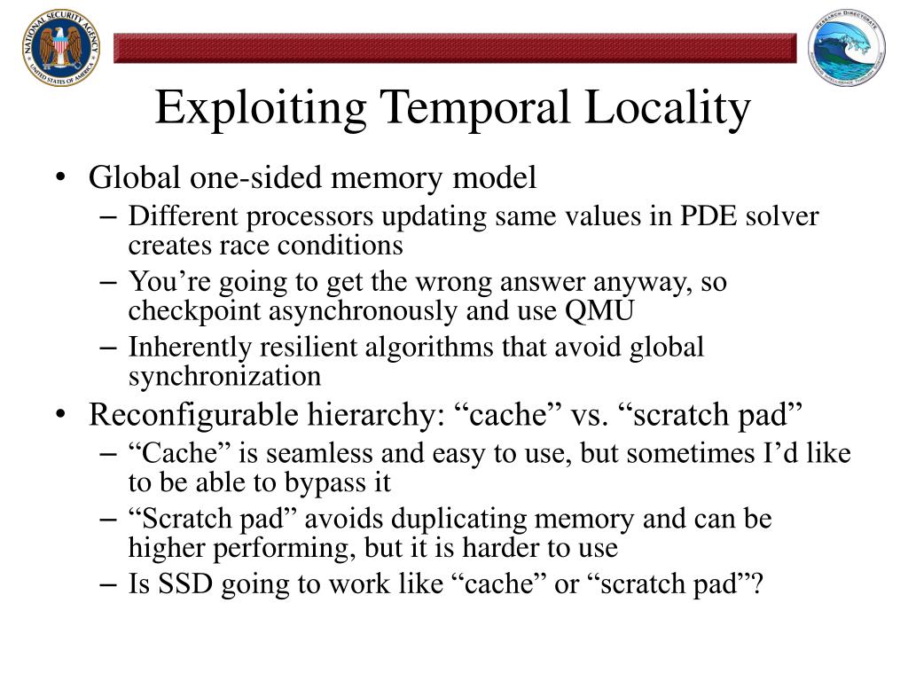 Exploiting Temporal Locality • Global one-sided memory model • Different processors updating same values in PDE solver creates race conditions • You’re going to get the wrong answer anyway, so checkpoint asynchronously and use QMU • Inherently resilient algorithms that avoid global synchronization • Reconfigurable hierarchy: “cache” vs. “scratch pad” • “Cache” is seamless and easy to use, but sometimes I’d like to be able to bypass it • “Scratch pad” avoids duplicating memory and can be higher performing, but it is harder to use • Is SSD going to work like “cache” or “scratch pad”?