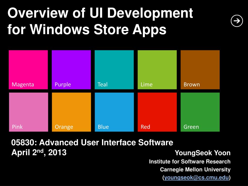 Overview of UI Development for Windows Store Apps. 05830: Advanced User Interface Software April 2 nd , 2013. YoungSeok Yoon Institute for Software Research Carnegie Mellon University ( youngseok@cs.cmu.edu ). What will be covered today?. Introduction to Windows Store Apps. XAML.
