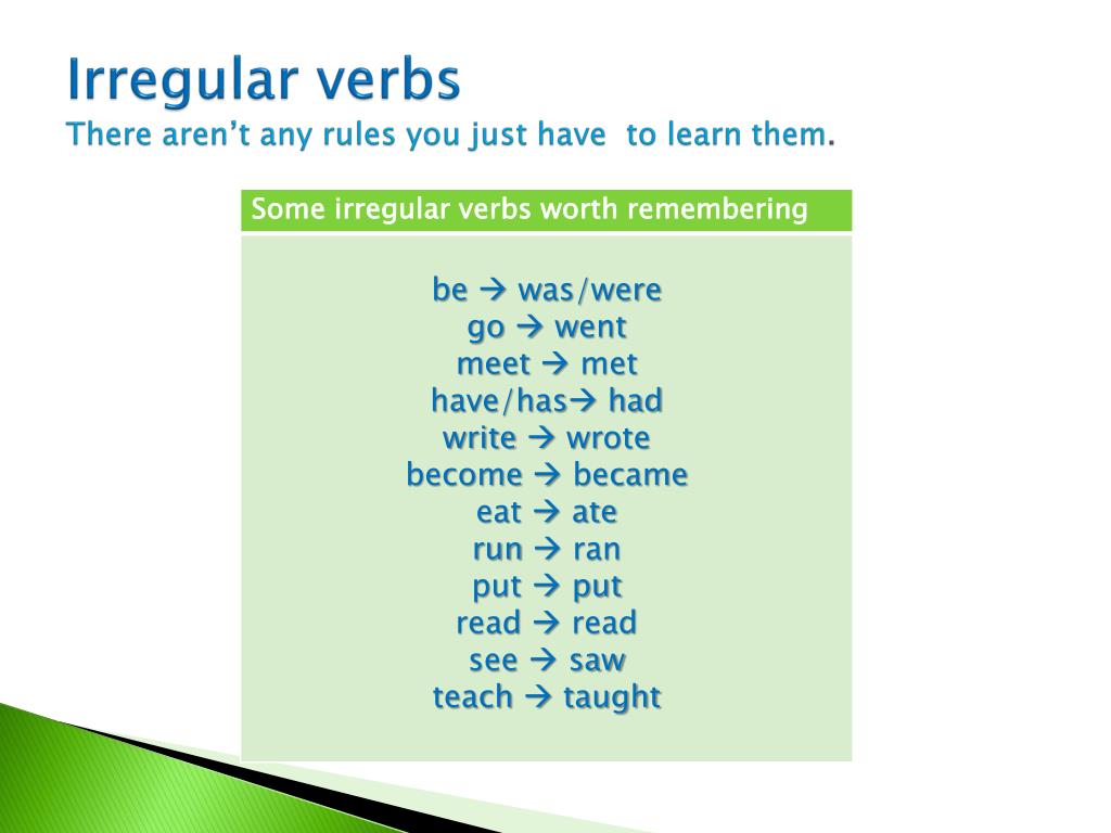 Note: • Did/Didn’t means the sentence is already in the past. So, innegativesand inquestionsit isn’t necessary to add –ed to the main verb. You don’t say “I didn’t worked”, but “I didn’t work”!Youdon’tsay: ”Didshe went home?”, but Didshe go home?