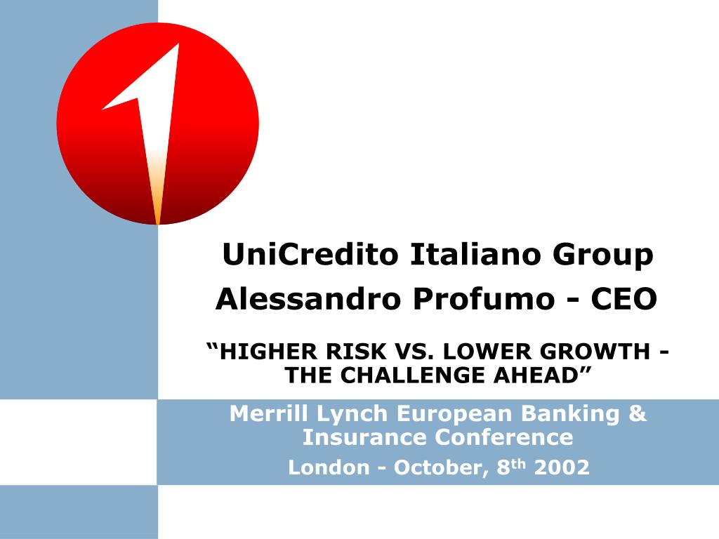 UniCredito Italiano Group Alessandro Profumo - CEO “HIGHER RISK VS. LOWER GROWTH - THE CHALLENGE AHEAD” Merrill Lynch European Banking & Insurance Conference London - October, 8th 2002