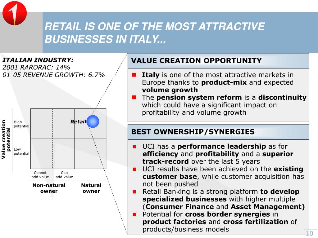 RETAIL IS ONE OF THE MOST ATTRACTIVE BUSINESSES IN ITALY... ITALIAN INDUSTRY: 2001 RARORAC: 14% 01-05 REVENUE GROWTH: 6.7% VALUE CREATION OPPORTUNITY • Italy is one of the most attractive markets in Europe thanks to product-mix and expected volume growth • The pension system reform is a discontinuity which could have a significant impact on profitability and volume growth Retail High potential BEST OWNERSHIP/SYNERGIES Value creation potential • UCI has a performance leadership as for efficiency and profitability and a superior track-record over the last 5 years • UCI results have been achieved on the existing customer base, while customer acquisition has not been pushed • Retail Banking is a strong platform todevelop specialized businesses with higher multiple (Consumer Finance and Asset Management) • Potential for cross bordersynergies in product factories and cross fertilization of products/businessmodels Low potential Cannot add value Can add value Non-natural owner Natural owner
